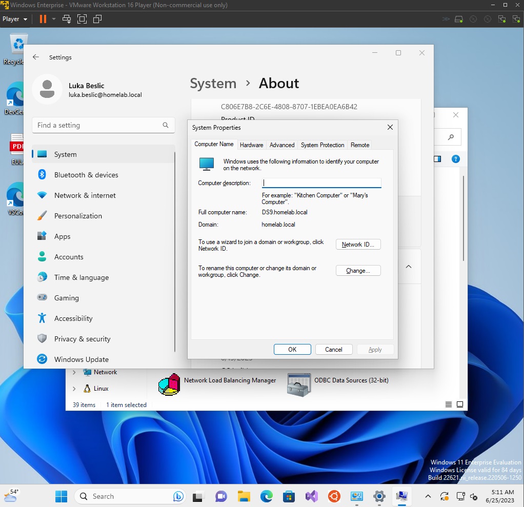 Let us try some use cases of AD to show what it looks like. We have set VM Windows Server 2019 to serve our domain, and for the client, we are using VM Windows Enterprise Edition. You can see that this client is a member of the "homelab.local" domain.