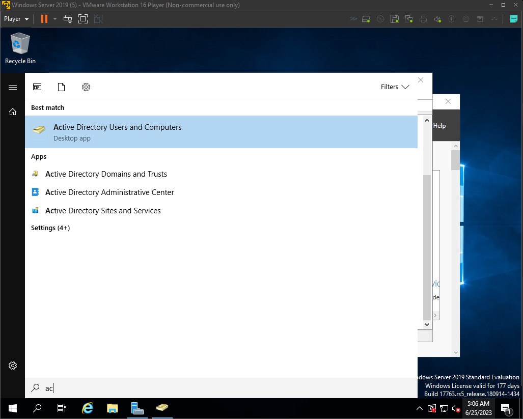 To run Active Directory on your server machine, type it in the Start search bar and select Active Directory Users and Groups.
